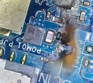 確認するとコンデンサではなく、SMDインダクタが焼けていました。隣のチップコンデンサ3個もダメでした。